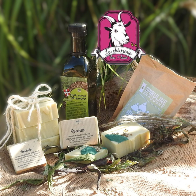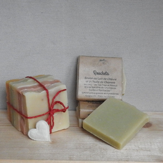 Composition : Lait de Chèvre, Graisse et Huiles saponifiées d’Olive, de Pépins de raisin, de Coco, de Tournesol, Huile de Chanvre, HE de Tea Tree, de Niaouli, Spiruline, (contient naturellement du Linalol, D-Limonene)