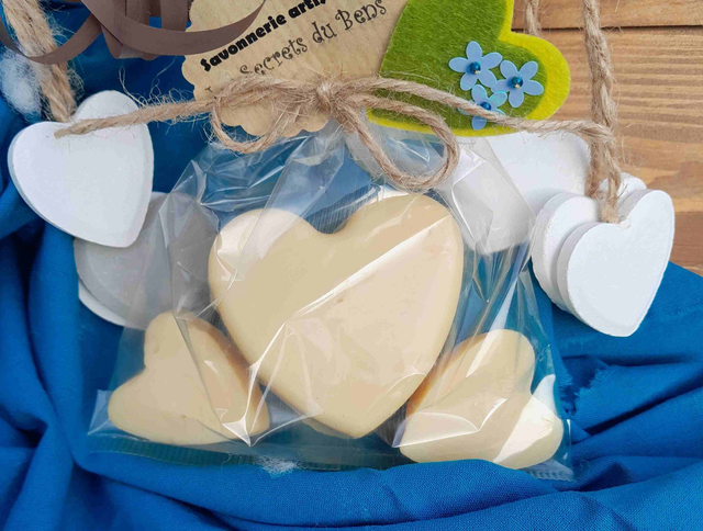 Existe en pain de savon de 100g, mini-savon de 25g ou moulé en forme d'animaux (grenouille, renard, écureuil, chat, marmotte, ourson, hérisson, hippopotame, bonhomme de neige, sapin de noël...) ou en forme de Cœur