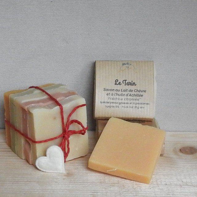 Composition : Lait de Chèvre, Graisse et Huiles saponifiées d’Olive, de Pépins de raisin, de Coco, de Tournesol, Huile d’Achillée, HE de Litsée citronnée (contient naturellement du Linalol, Citral, D-Limonene, Geraniol)